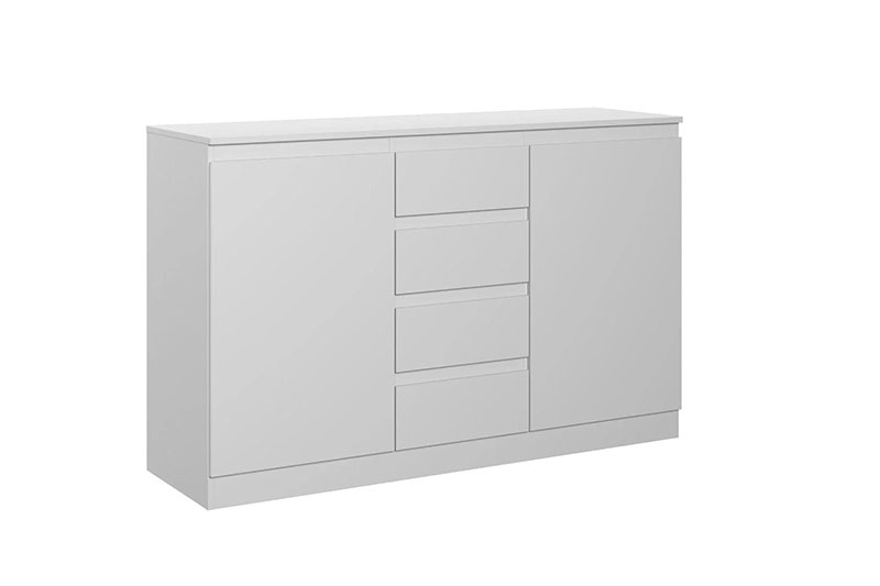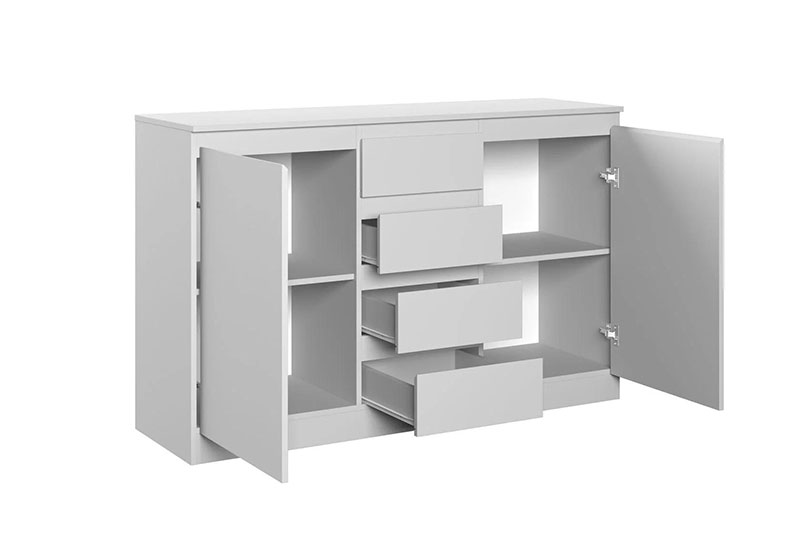 Система хранения оборудована четырьмя выдвижными ящиками и двумя отделениями с распашными дверцами, с удобными скошенными ручками на фасадах, может использоваться как комод для белья, шкаф для вещей, шкаф для игрушек и много другого.