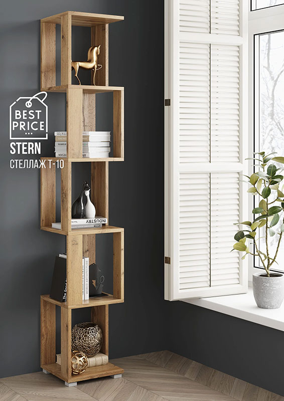 Стеллаж «Stern» станет эффектным и функциональным дополнением к системе хранения в любом интерьере. Его оригинальная конструкция компактна, но при этом позволяет красиво расставить книги, предметы декора, комнатные растения или детские игрушки. Открытые полки визуально не загромождают пространство, что делает эту модель удачным решением как для просторной, так и для небольшой комнаты.