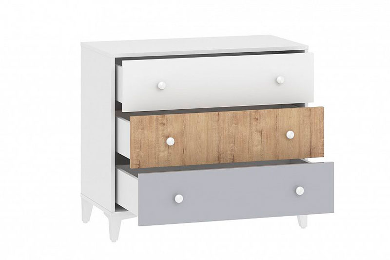 Комод «Морти» - прекрасный выбор для интерьера в стиле Современный, Модерн, Скандинавский. Три удобных выдвижных ящика станут вместительным место для хранения белья, предметов одежды и аксессуаров. В оттеночной гамме мебели царит стильное сочетание современности, изюминкой модели являются цвета ящиков: белый, серый и дуб бунратти.