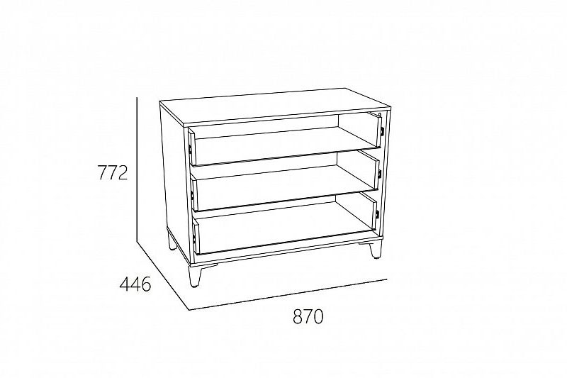 Выдвижные ящики оснащены шариковыми направляющими полного выдвижения, равномерно распределяют вес содержимого и обеспечивают плавный бесшумный ход ящика. Высокие опоры зрительно облегчают конструкцию и более удобны для уборки.Комод отлично сочетается с другими моделями коллекции «Морти».