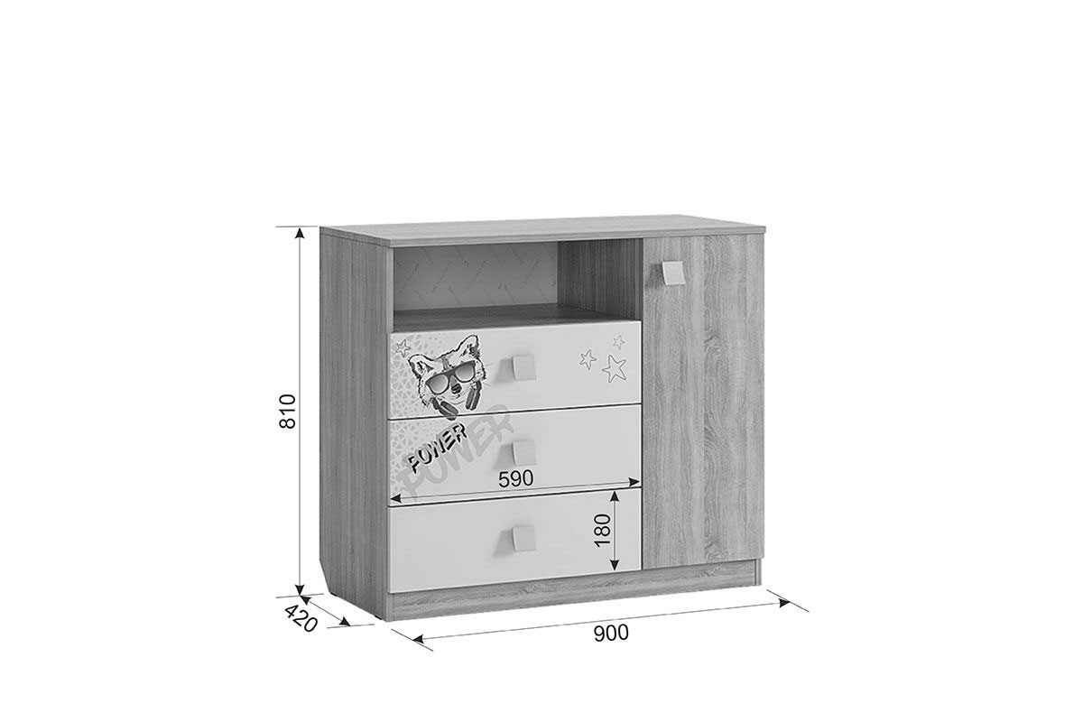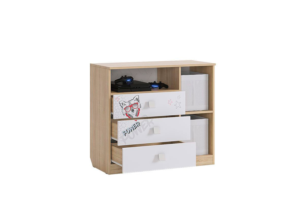 Этот комод предоставляет удобное хранение для детских вещей, игровых приставок и даже телевизора. С открытыми и закрытыми полками, а также ящиками, он обеспечивает легкий доступ ко всему содержимому. Вырез под плинтус делает модель еще более практичной.