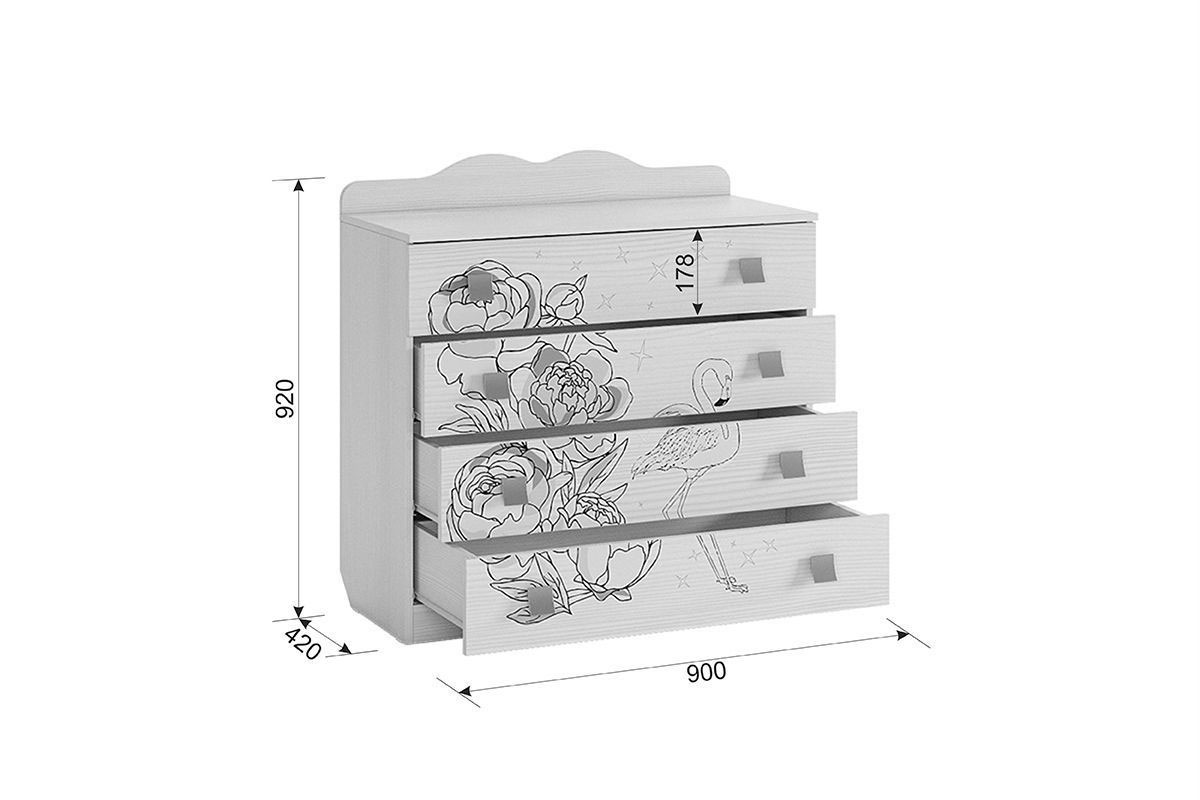 Ящики: четыре просторных отделения с роликовыми направляющими для хранения детских вещей, белья или игрушек.