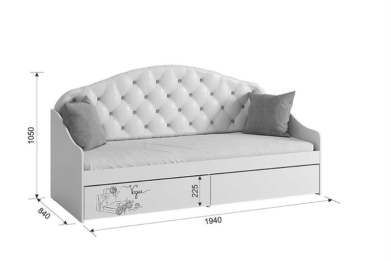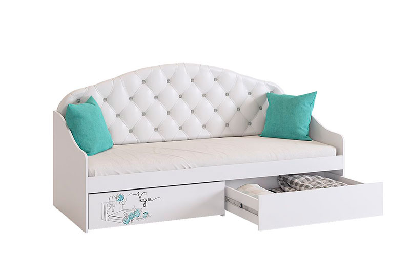Софа из серии «Гламур» выполнена в белом цвете. Крашеные фасады выдвижных ящиков из МДФ цвета белый глянец украшены 5D фрезеровкой и принтерным рисунком. Мягкая спинка софы из гипоаллергенной экокожи, украшена каретной стяжкой с крупными стразами-пуговицами. Софа станет не только украшением, но и уютным спальным местом для юной модницы. В выдвижных ящиках можно хранить постельное белье. Рекомендуемый размер матраса 800х1900.