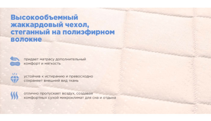 Несъемный чехол из жаккарда, стеганный на синтепоне. Придает матрасу дополнительный комфорт и мягкость. Устойчив к истиранию и превосходно сохраняет внешний вид. Отлично пропускает воздух, создавая комфортных сухой микроклимат для сна и отдыха.