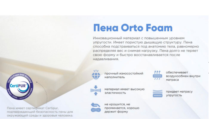 • Пена Orto Foam – 1 см. Инновационный материал с повышенным уровнем упругости. Имеет пористую дышащую структуру. Эластичная пена способна подстраиваться под анатомию тела, равномерно распределяя вес и снимая нагрузку. Пена долго не теряет свою форму и быстро восстанавливается после надавливания.