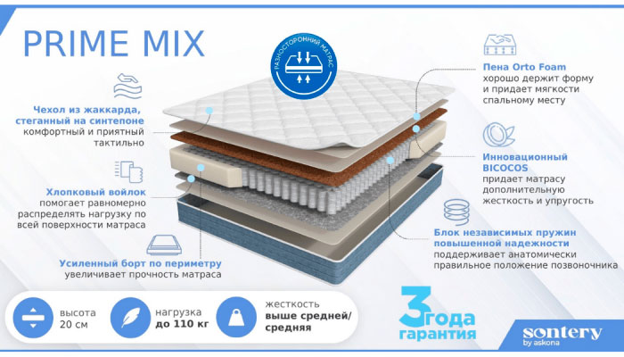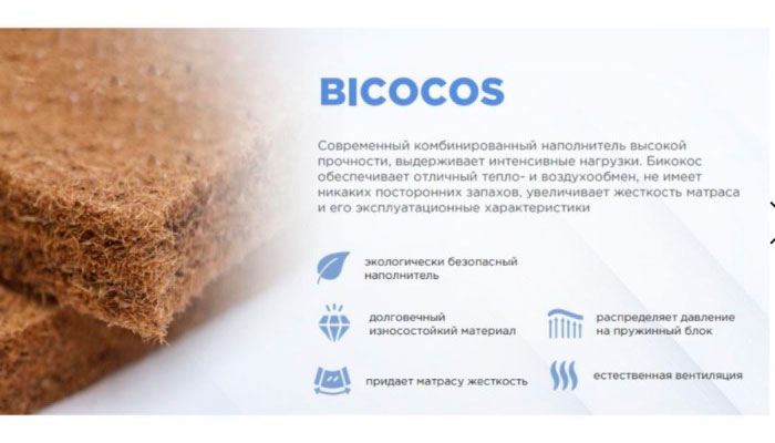 • Бикокос – 1 см. Современный комбинированный наполнитель высокой прочности, выдерживает интенсивные нагрузки. Бикокос обеспечивает отличный тепло- и воздухообмен, не имеет никаких посторонних запахов, увеличивает жесткость матраса и его эксплуатационные характеристики.
