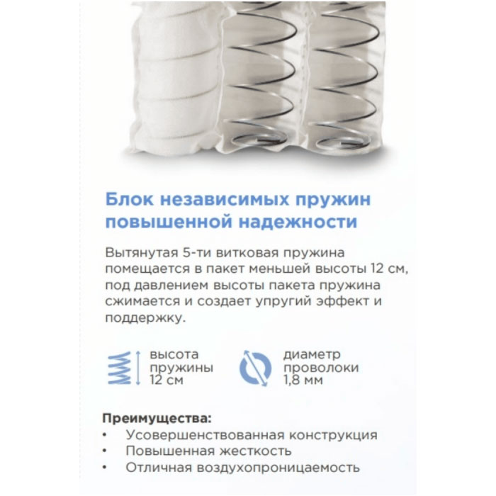 • Блок независимых пружин повышенной надежности (500 штук на спальное место). Вытянутая 5-ти витковая пружина помещается в пакет меньшей высоты 12 см, под давлением высоты пакета пружина сжимается и создает упругий эффект и поддержку. Диаметр проволоки – 1,8 мм. Боковины пружинного блока усилены ППУ, что увеличивает прочность матраса.