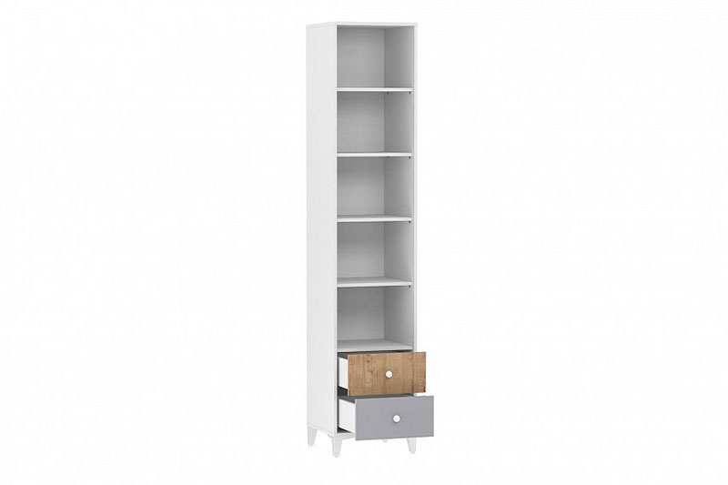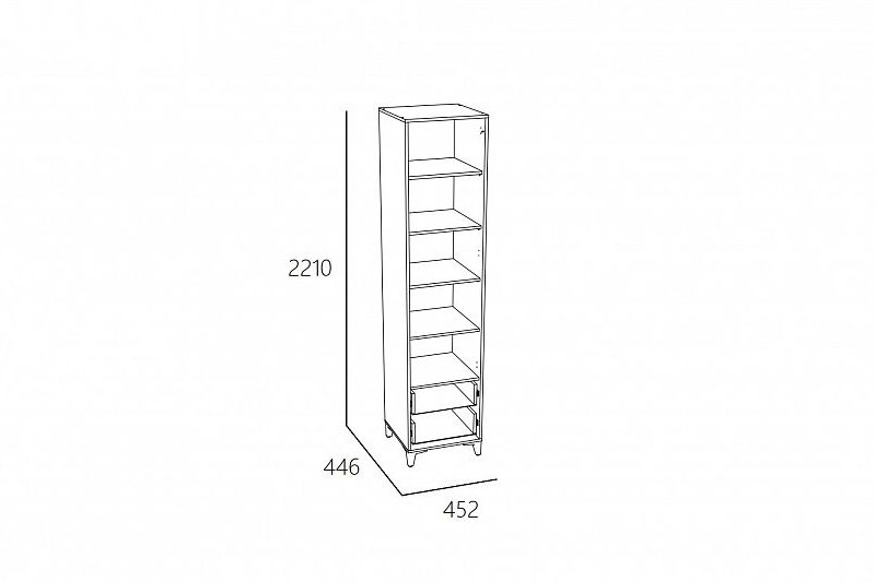 Шкаф-пенал «Морти» – обустроен 5 нишами-полками и двумя выдвижными ящиками, что превращает его в удобное и вместительное место для хранения. Такой шкаф хорошо использовать для декорирования комнаты. Вы можете легко вписать этот предмет интерьера в пространство любой площади.