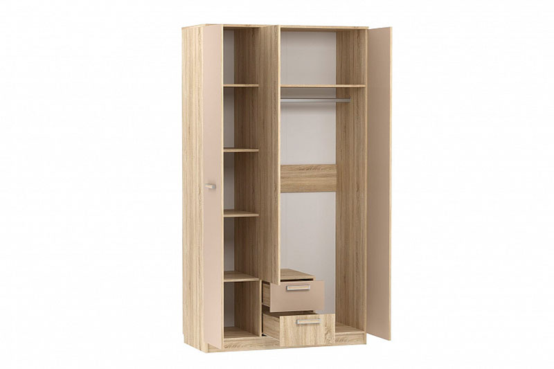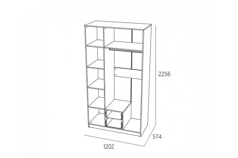 Данный шкаф имеет компактные размеры, но, при этом многофункционален. Внутри модуля предусмотрены овальная штанга для одежды на вешалках, в том числе для размещения длинных вещей. Вместительная часть с пятью полками, позволит рассортировать и разместить большое количество вещей. Два выдвижных ящика внизу идеальны для хранения мелкой одежды. Классические глухие фасады надежно защитят содержимое шкафа от влаги и пыли.