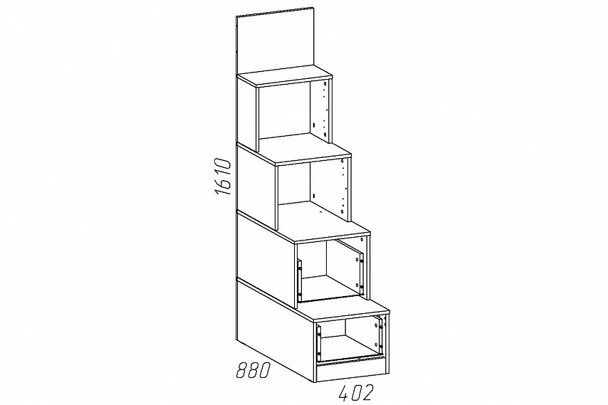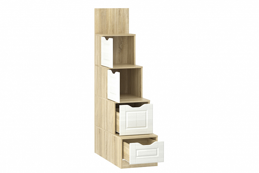 Стеллаж Оливия НМ 011.64 Х используется в качестве лестницы к верхнему спальному месту двухъярусных кроватей из той же коллекции. Модуль оснащен четырьмя закрытыми секциями для хранения игрушек, белья и мелочей. Интегрированные ручки минимизируют риск получения ребенком травмы во время использования модуля. В комплект к стеллажу можно приобрести поручень ОЛИВИЯ НМ 011.64 М, который защитит ребенка от случайного падения.