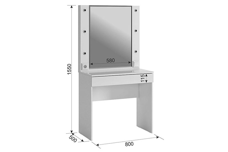 Трюмо Гламур спроектировано, чтобы удовлетворить потребности современной юной леди. С широким зеркалом, яркой подсветкой и просторным ящиком для аксессуаров, это трюмо идеально подходит для каждодневного использования. Дополнительный функционал в виде розетки позволяет без проблем подключить фен или другую косметическую технику. А удобные патроны для ламп, выключатель и длинный провод делают его еще более практичным. Стоит отметить, что лампы в комплектацию не включены.