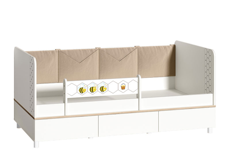 Кровать оснащена съёмным мягким элементом с карманами, передвижным бортиком и декорирована оригинальным рисунком - мультяшными пчёлками, которые никого не оставят равнодушным.
