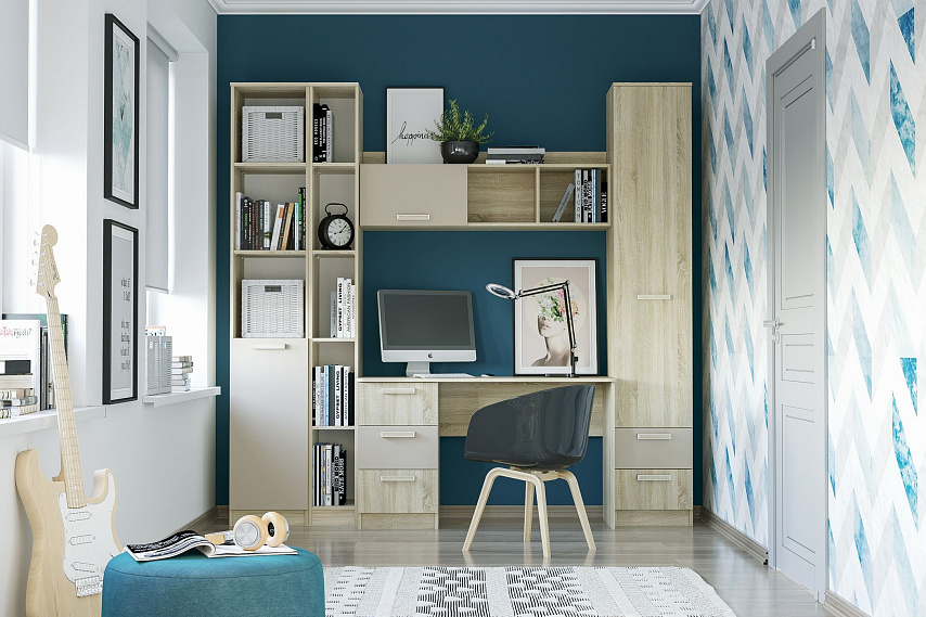 Если в детской необходимо организовать удобное учебное место, то стоит обратить внимание на комплектацию №3 из коллекции АКВАРЕЛЬ. Благодаря особому расположению модулей, все необходимые для занятий принадлежности будут сразу под рукой. Сочетание книжного шкафа и стеллажа позволит аккуратно разместить и систематизировать все учебники и домашние книги. Несмотря на обилие в данном наборе модулей для учебы, с ним в детской появится место и для хранения одежды. Комплектация № 8 - это все, что нужно для комнаты ребенка-подростка.
