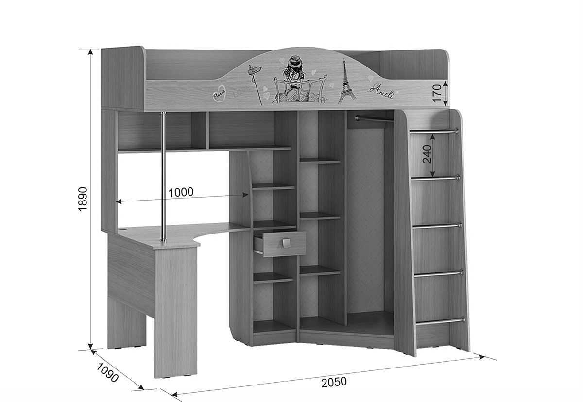 Состоит из: шкафа для одежды, стола, выдвижного ящика, шкафа с полкой, спального места, полок.