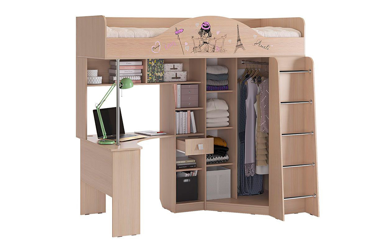 Вы думаете, как разместить мебель в комнате ребенка? Комплекс детский «Амели» настоящий спаситель 4 в 1: в нем сочетается шкаф для одежды, рабочий стол, полки для книг и место для сна ребенка. Стильный принтерный рисунок придаст шика и современности Вашему интерьеру. Комплекс отлично дополнят другие модули коллекции «Амели». Матрац 2000х800 мм комплектуется отдельно. Сборка универсальная.