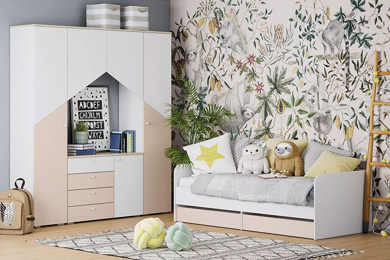 Комплектация представлена в двух цветах - Макарун и Бисквит. Оригинальный дизайн в виде домиков придаст интерьеру уникальность. Скругленные ручки на ящиках и дверцах делают мебель безопасной для детей. Кровать оснащена бельевыми ящиками, в которых можно хранить постельное белье, игрушки, обувь или другие вещи. В двустворчатом шкафу удобно повесить одежду на вешалках, а письменный стол оборудован тремя выдвижными ящиками для организации рабочего пространства ребенка.