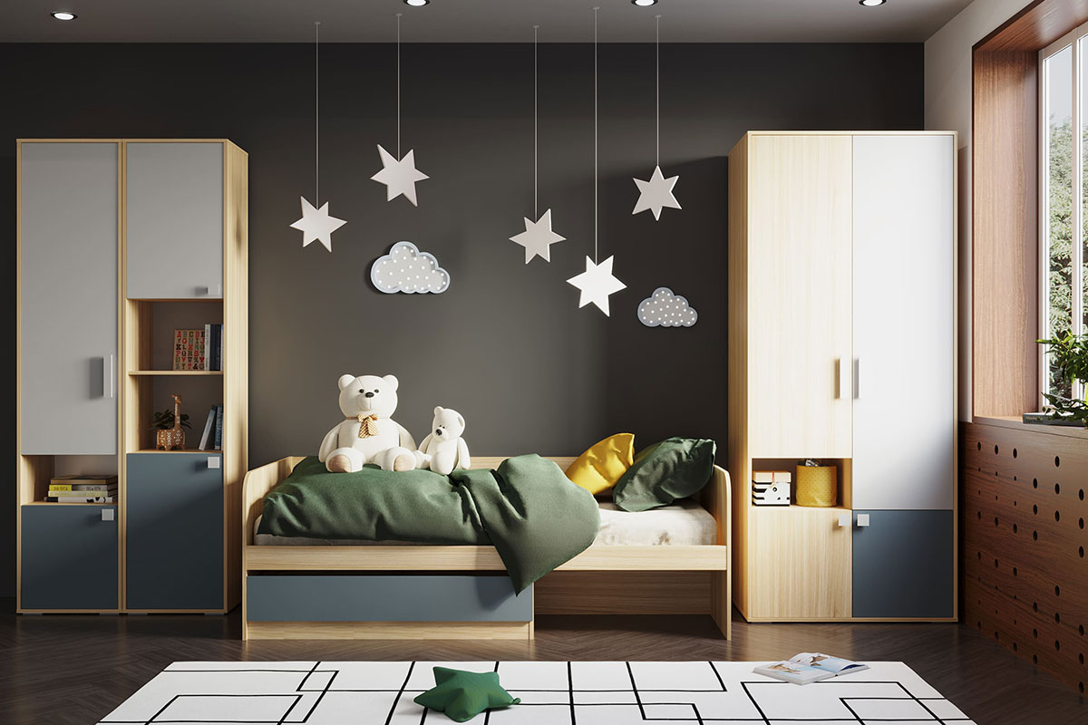 Комплектация №2 включает кровать с ящиком для хранения белья, который можно оборудовать как на левую, так и на правую стороны, два панельных шкафа с полками, в которых ребенок может удобно расположить все необходимые книги, школьные материалы и игрушки, а также шкаф с полками и овальной штангой для хранения одежды на вешалках.