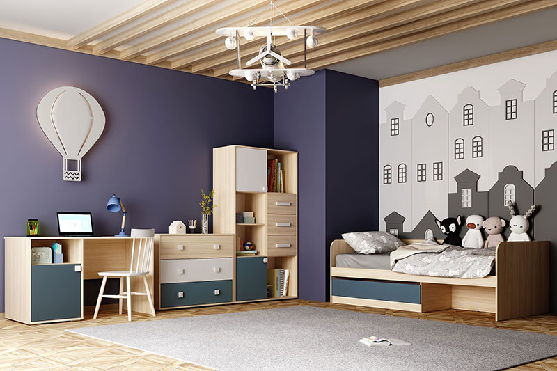 Комплектация №3 представляет собой готовый комплект для стильного и современного обустройства детской. Кровать имеет спинки закругленной формы, что исключает риск случайных повреждений во время сна и активного времени ребенка, а дополнительный ящик для хранения вещей можно оборудовать как слева, так и справа. Письменный стол с широкой рабочей поверхностью оснащен распашной дверкой с полками для хранения школьных принадлежностей. У комода имеются три выдвижных ящика со встроенной перегородкой для оптимального хранения вещей. Стеллаж также оснащен тремя выдвижными ящиками, а на открытых полках удобно расставить книги, игрушки и украсить комнату, как нравится ребенку.