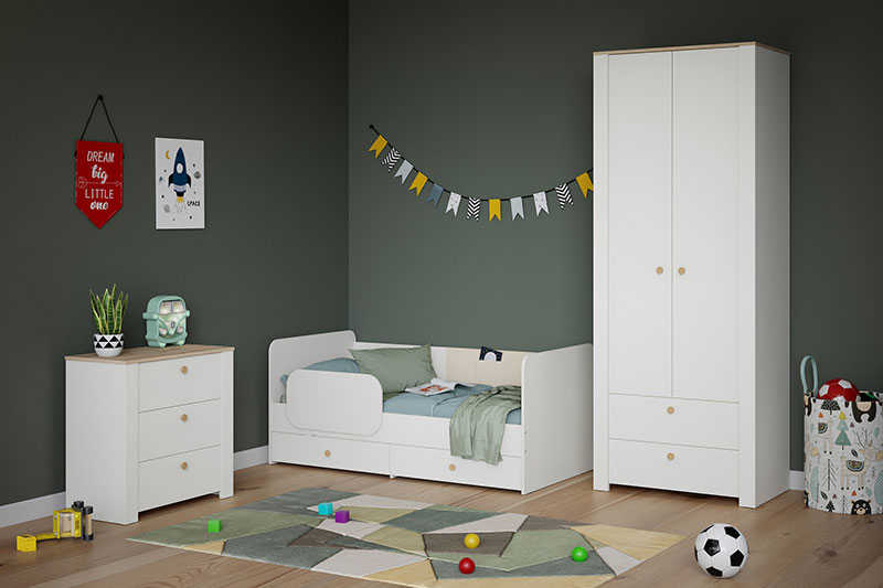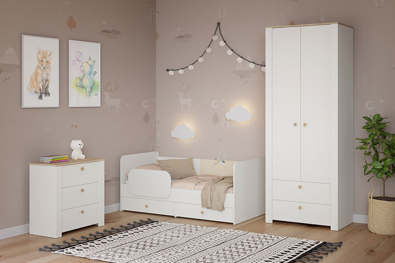 Джастин уникален тем, что подходит для разных возрастных категорий: для малышей – кроватка с защитным бортиком, съемными тканевыми кармашками и выкатными ящиками; для подростков – кровать с полноценным спальным местом и нишей для книг в изголовье; всевозможные модули для хранения. А в ящик письменного стола можно спрятать под замочек свои сокровища и секреты.