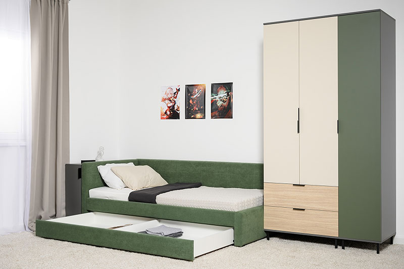Все вещи ребёнка будут на своём месте. На столе есть крепление для рюкзака или наушников. Наполнение шкафов для одежды можно менять на выбор: полки либо штанги. Петли фасадов оснащены доводчиками.