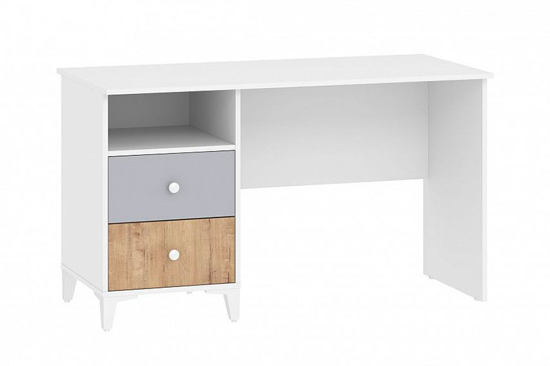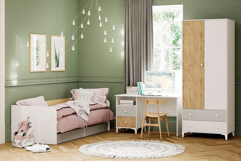 Комплектация №3 представляет собой готовый комплект для стильного оформления детской. В двустворчатом шкафу удобно повесить одежду на вешалках, письменный стол оснащен тремя выдвижными ящиками для оптимизации рабочего пространства ребенка, а кровать оборудована ящиками для хранения белья, обуви или других вещей.