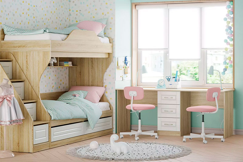 Комплектация №9 отлично подходит для комнаты, в которой живут два ребенка. Несмотря на свой минимальный набор, данная комплектация эргономична. Двухъярусная кровать совмещает в себе место для отдыха и место для хранения книг, учебных принадлежностей и белья, а уникальная конструкция стола поможет обустроить комфортный учебный уголок детям. Все самое нужное всегда под рукой!